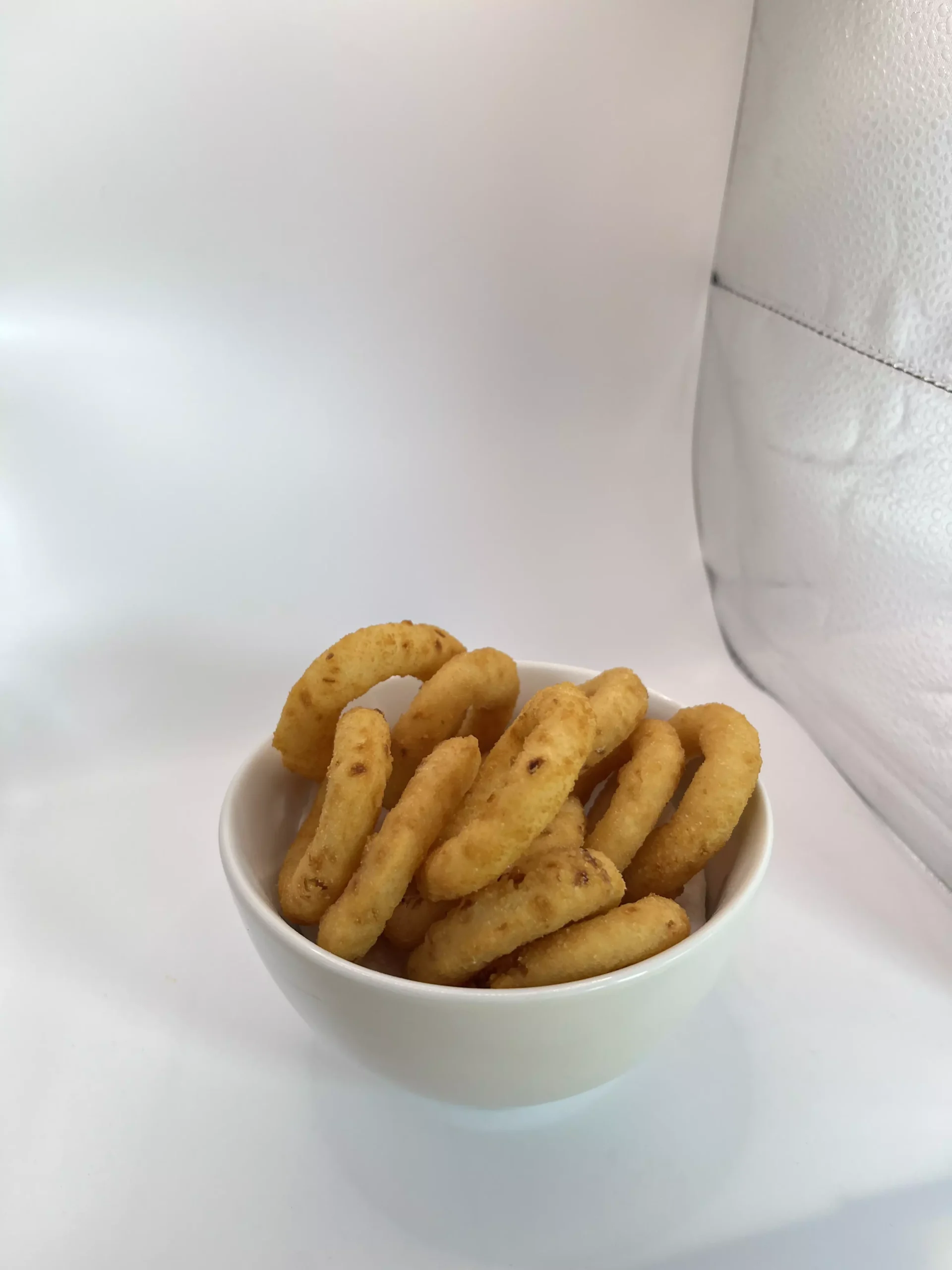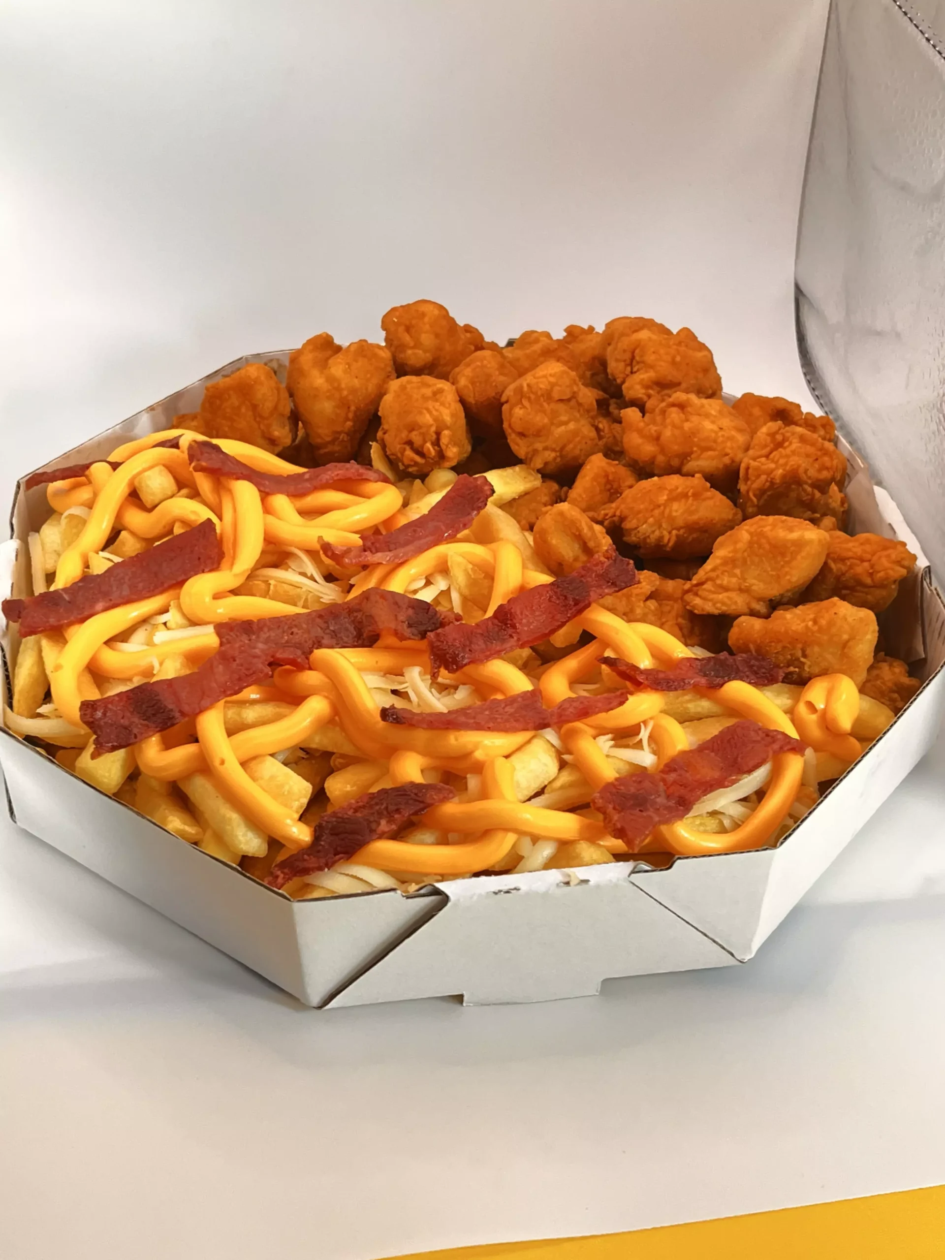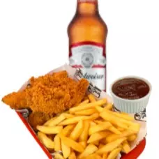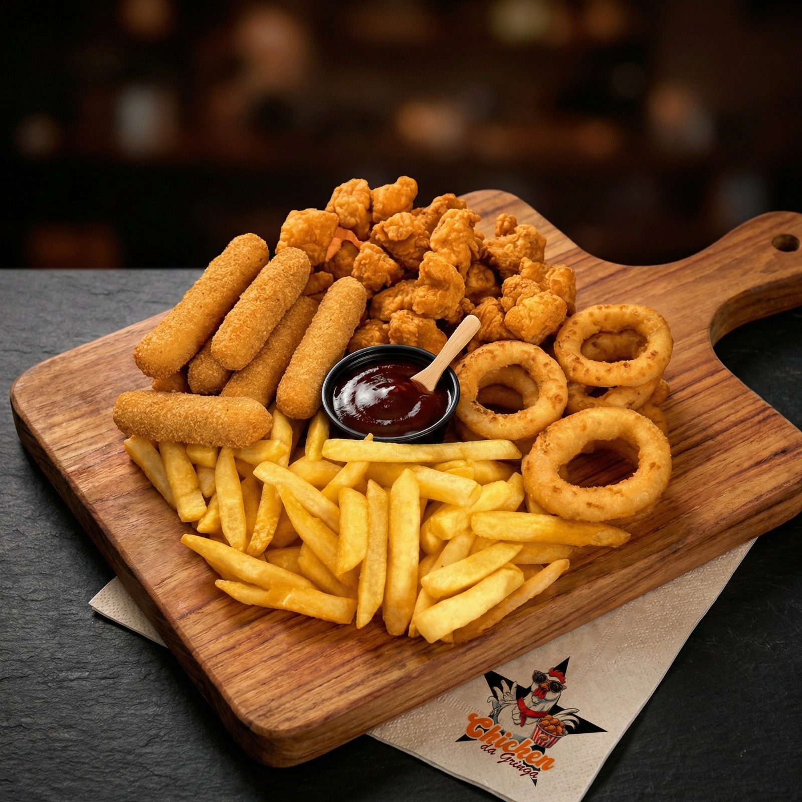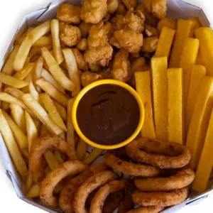 400g de sassami picado, 9 anéis de cebola, 250g batata, 6 stick de queijo e 1 molho de sua escolha.