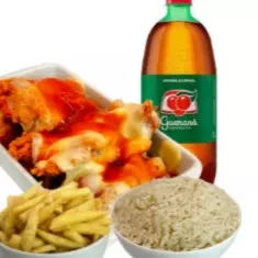 1 parmegiana para dois (arroz, 5 sassamis, molho de tomate, mussarela e batata) e 1 guaraná de 1 litro.
