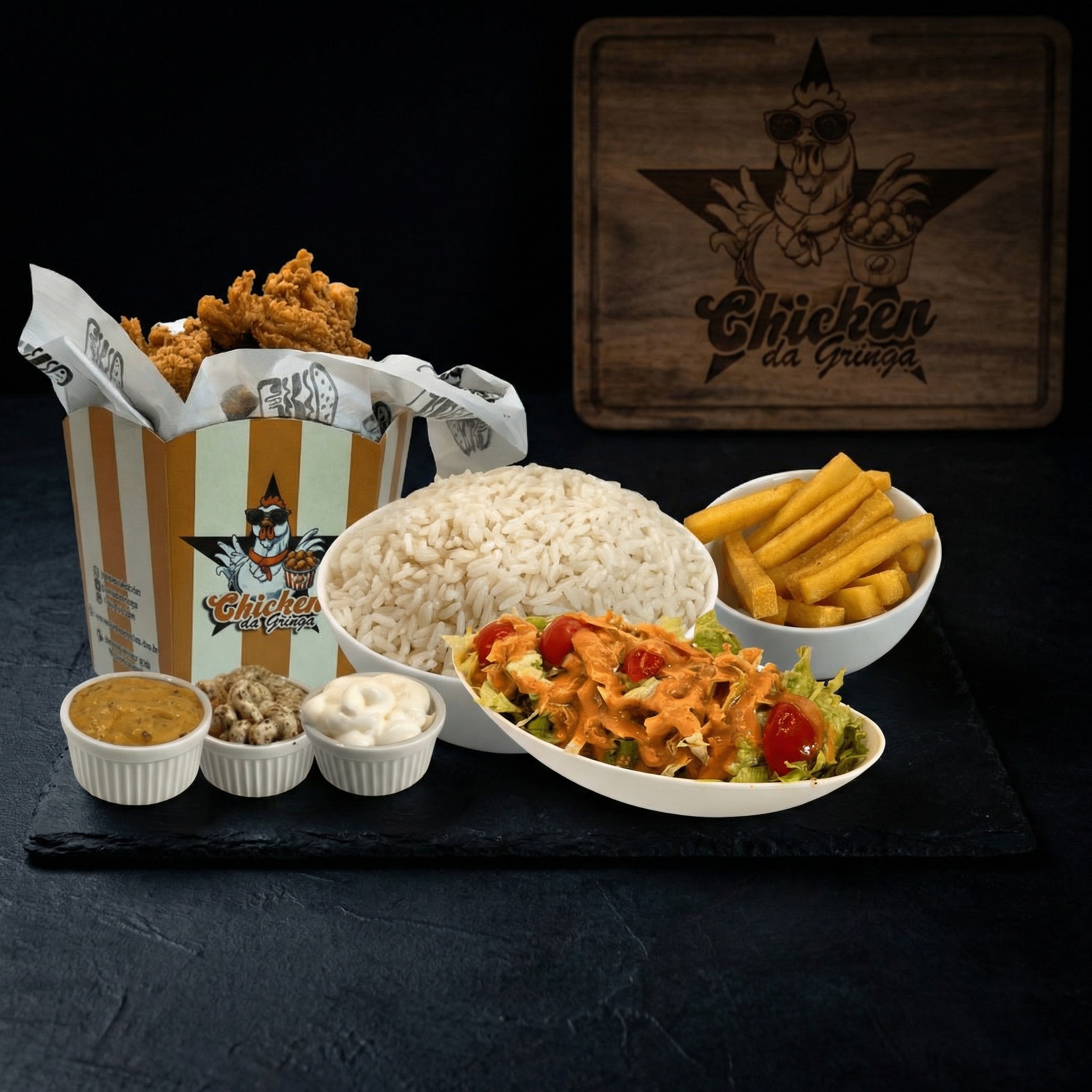 1 balde M, 3 molhos, 500g de arroz, 500g de batata ou polenta, salada de alface americana com tomate cereja e molho artesanal.